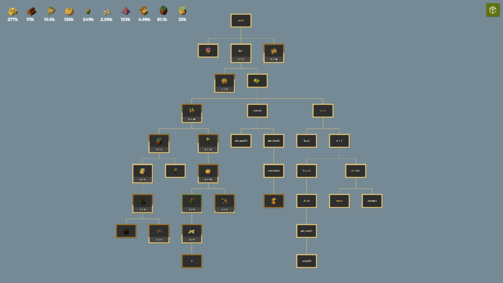 This game’s theme is programming. I was a farmer and oparated a deone to harvest. The operating is programming. Collecting crops are used unlock skills. Some crops use special situation.