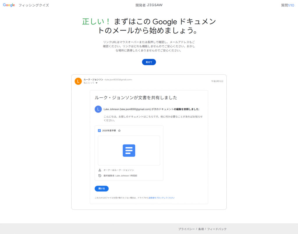 始まると2択が出てきます。フィッシングか正しいメールかですね。リンクは特に遷移するわけではないので問題ありません。ただ、フィッシングかどうかの判定に使うこともあるので、マウスをリンクの上に載せて確認することもあると思います。