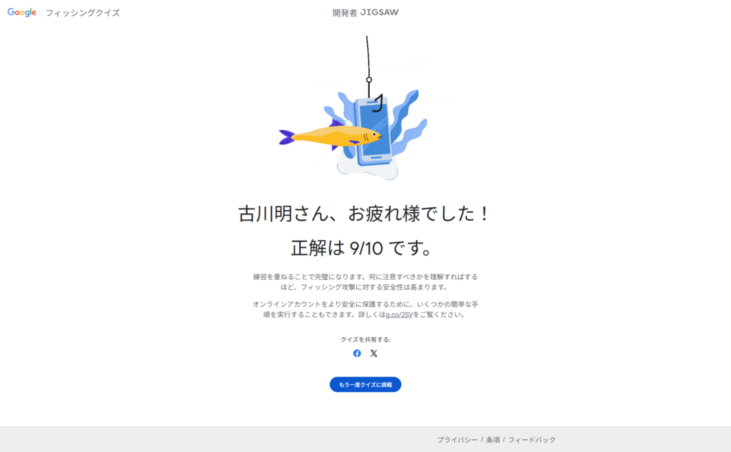 私は最終的に9/10の正解数でした。1問だけ引っかかりましたが他は特に問題なかったですね。メールアドレスの確認や文章、リンクをよく見れば間違えることは少ないかと思います。