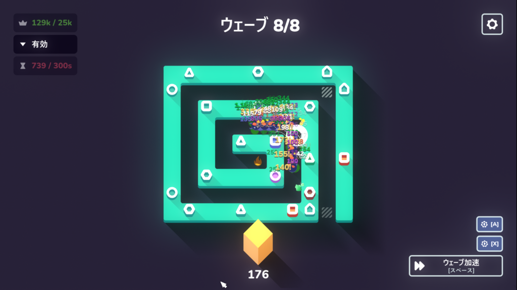 スロウと炎を解禁。慎重な配置と微妙な加速を使ってギリギリクリアだったので他のやり方が良いと思われる。